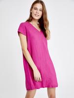 • Bayan Pembe V Yaka Kısa Kol Keten Elbise