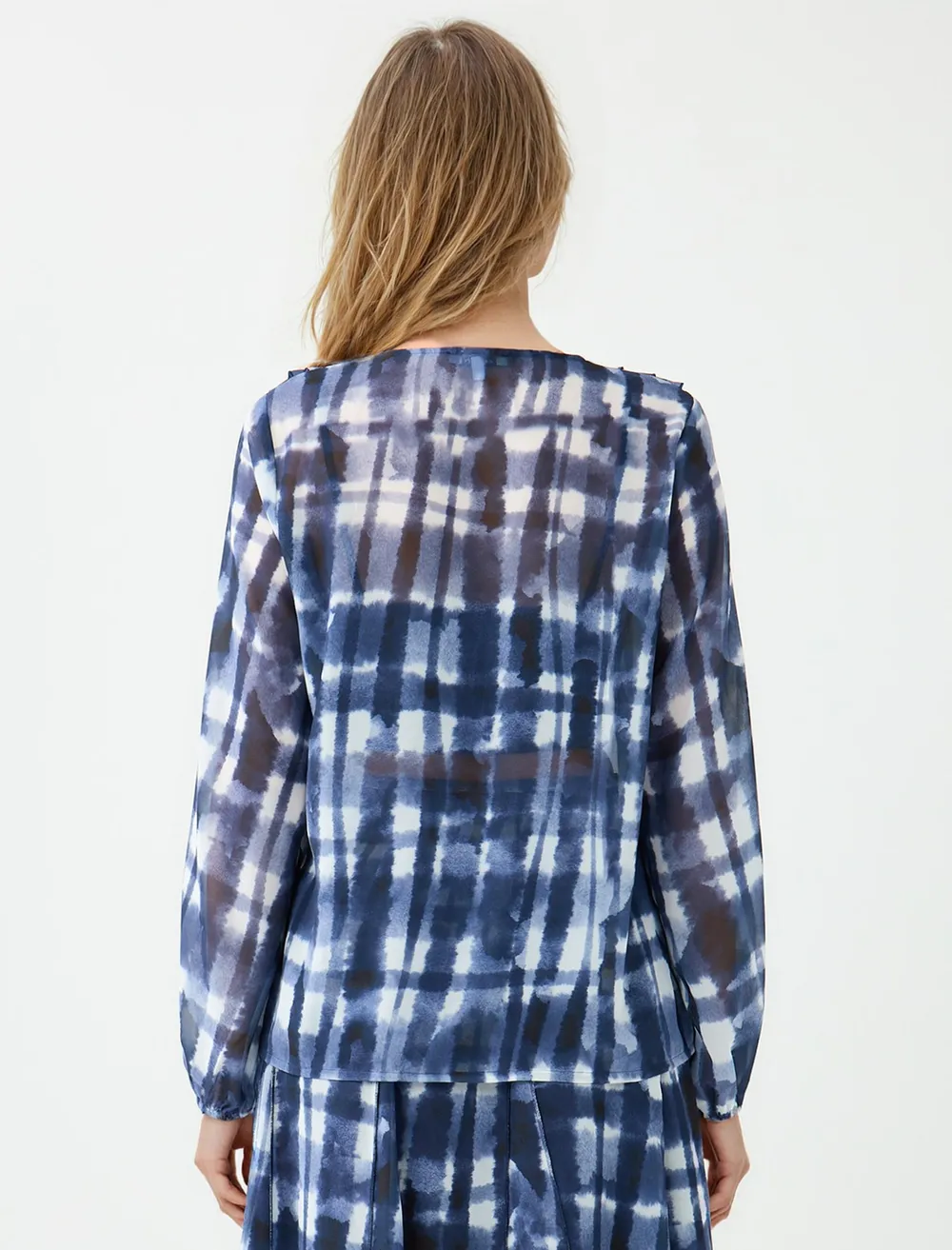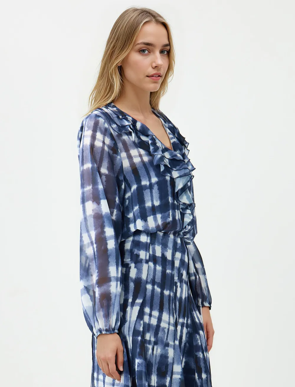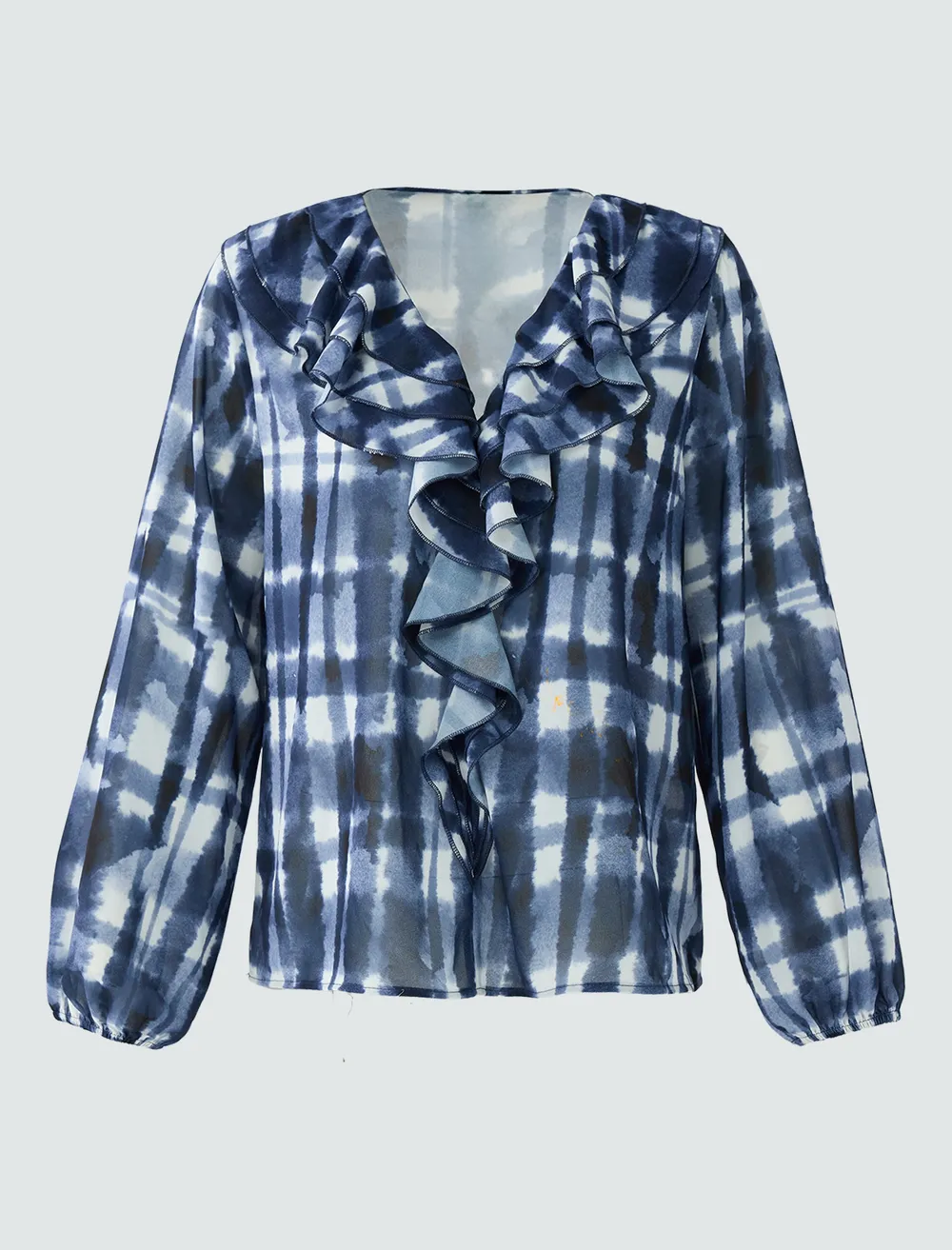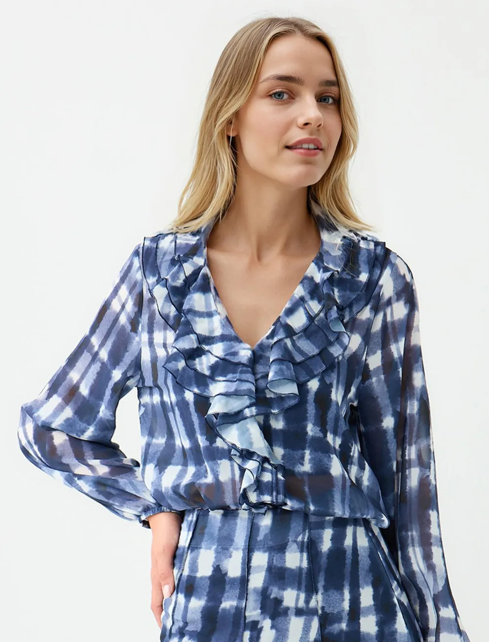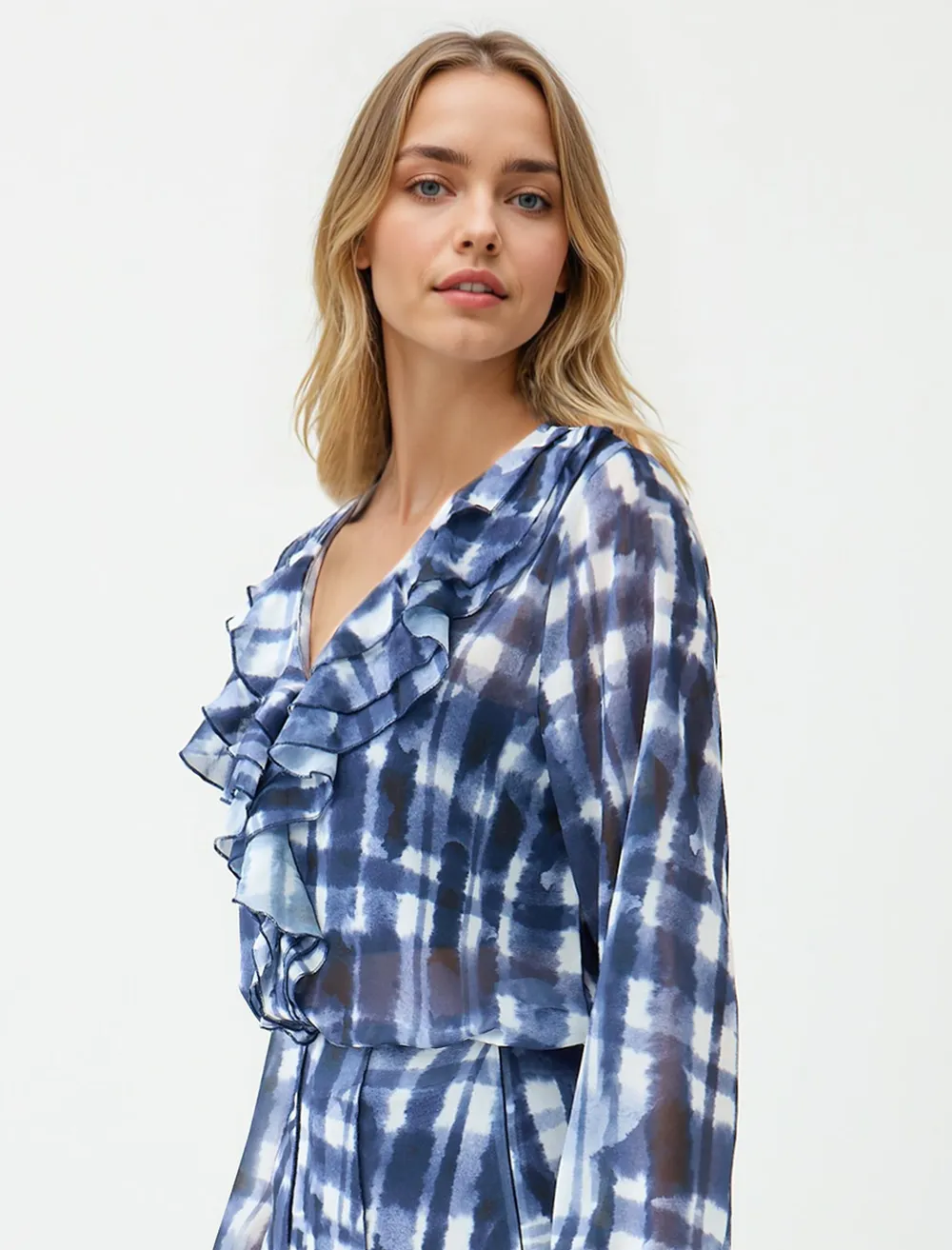 V Yaka Uzun Kollu Desenli Dokuma Bluz