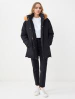 • Bayan Siyah Yandan Cepli Kapüşonu Kürk Detaylı Puf Mont