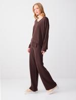 • Bayan Kahverengi Yüksek Bel Bol Paça Beli Lastikli Triko Pantolon
