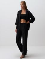 • Bayan Siyah Yüksek Bel Bol Paça Düz Keten Pantolon