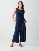 Lacivert Yüksek Bel Bol Paça Kısa Basic Dokuma Pantolon