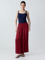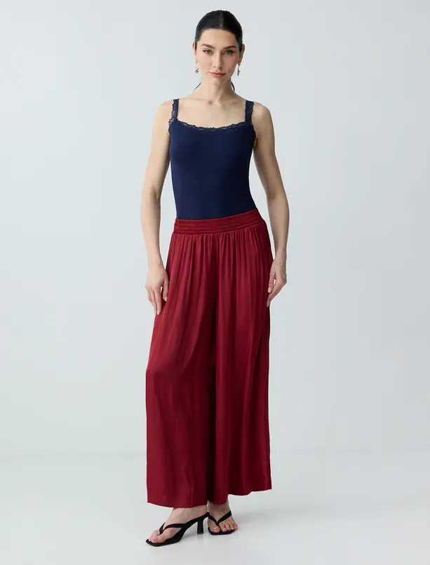 Bordo Yüksek Bel Bol Paça Saten Uzun Dokuma Pantolon