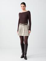 • Bayan Bej Melanj Yüksek Bel Ekose Desenli Mini Örme Şort Etek