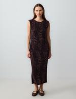 • Bayan Kahverengi Yuvarlak Yaka Desenli Kolsuz Örme Midi Elbise